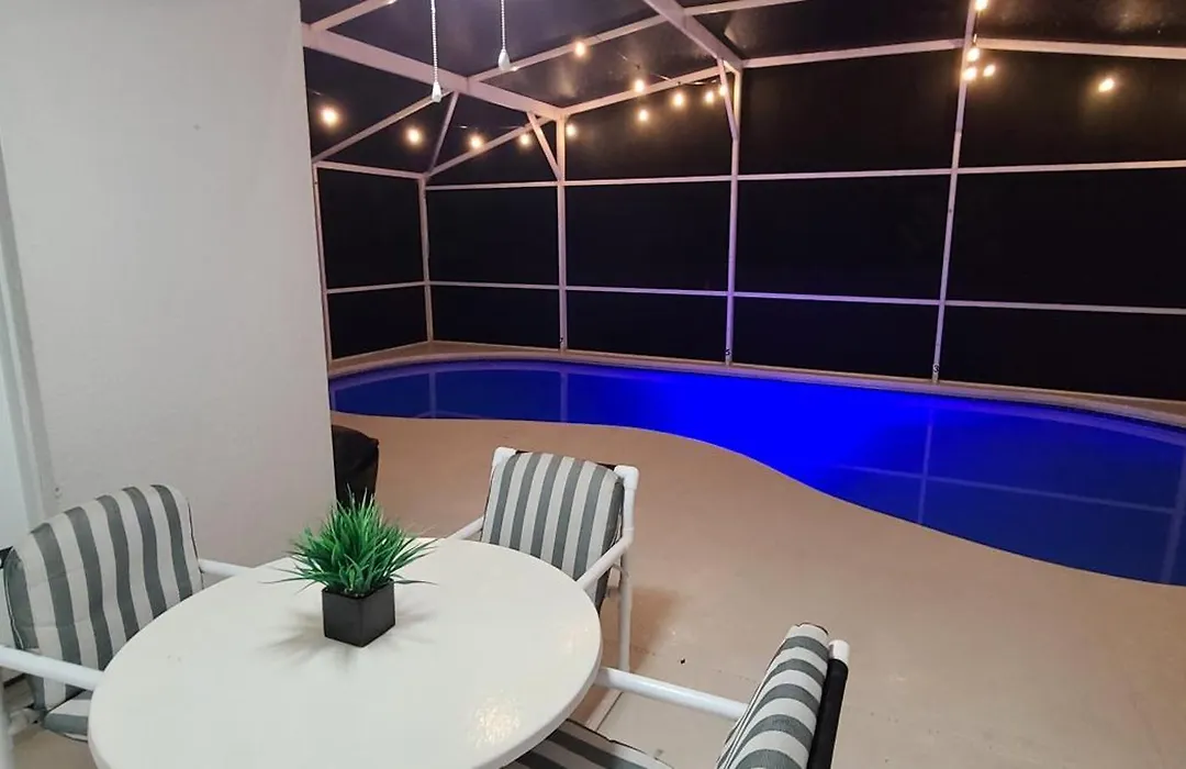 Home Close To Disney Parks/Amazing Private Pool beschikt over een patio en een eethoek met een bank en een bureau, evenals een flatscreen TV met satellietzenders. Een broekpers en airconditioning zijn aanwezig voor een comfortabel verblijf. Badkamervoorzieningen omvatten zowel een badkuip en een douche, evenals een droger en handdoeken.
